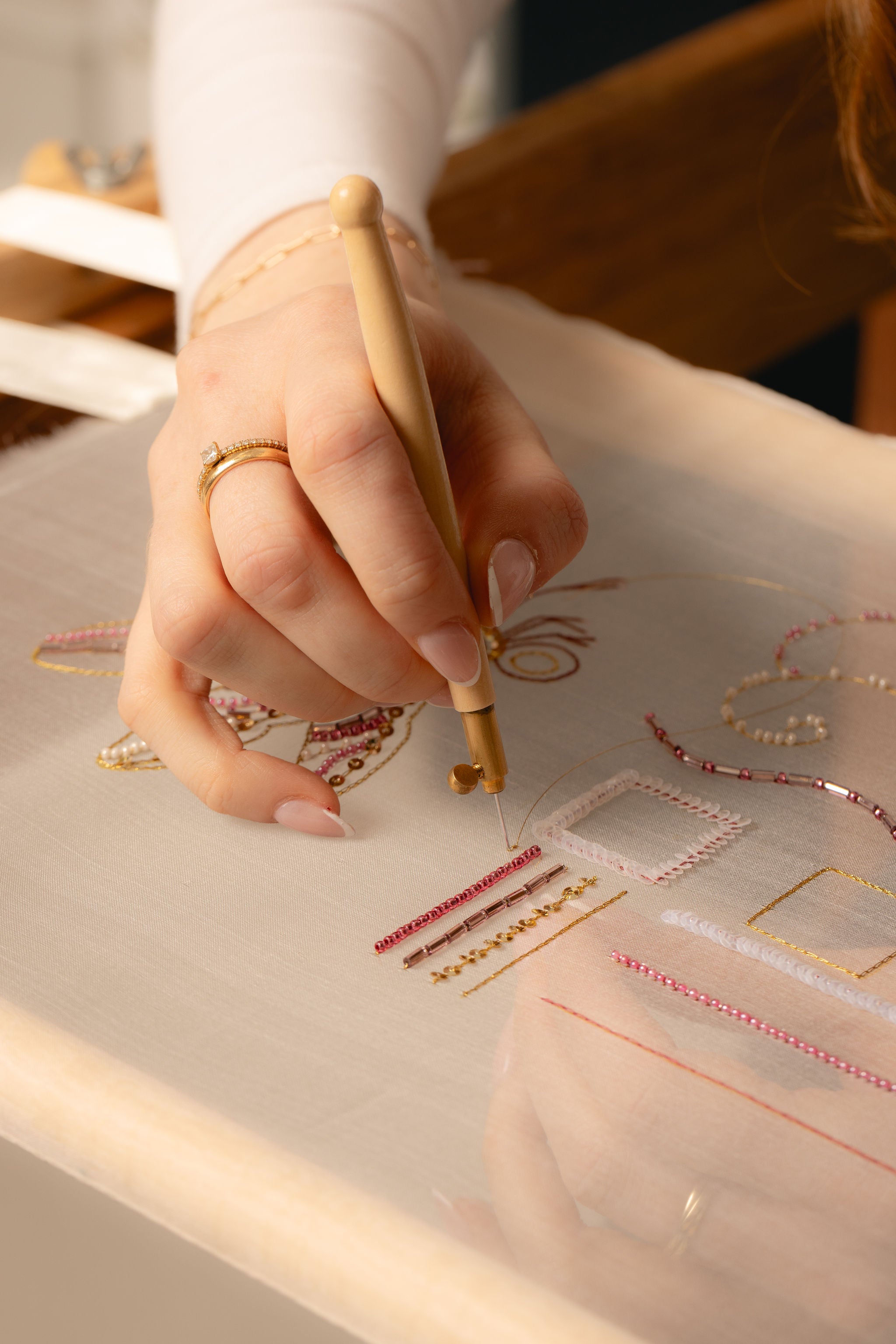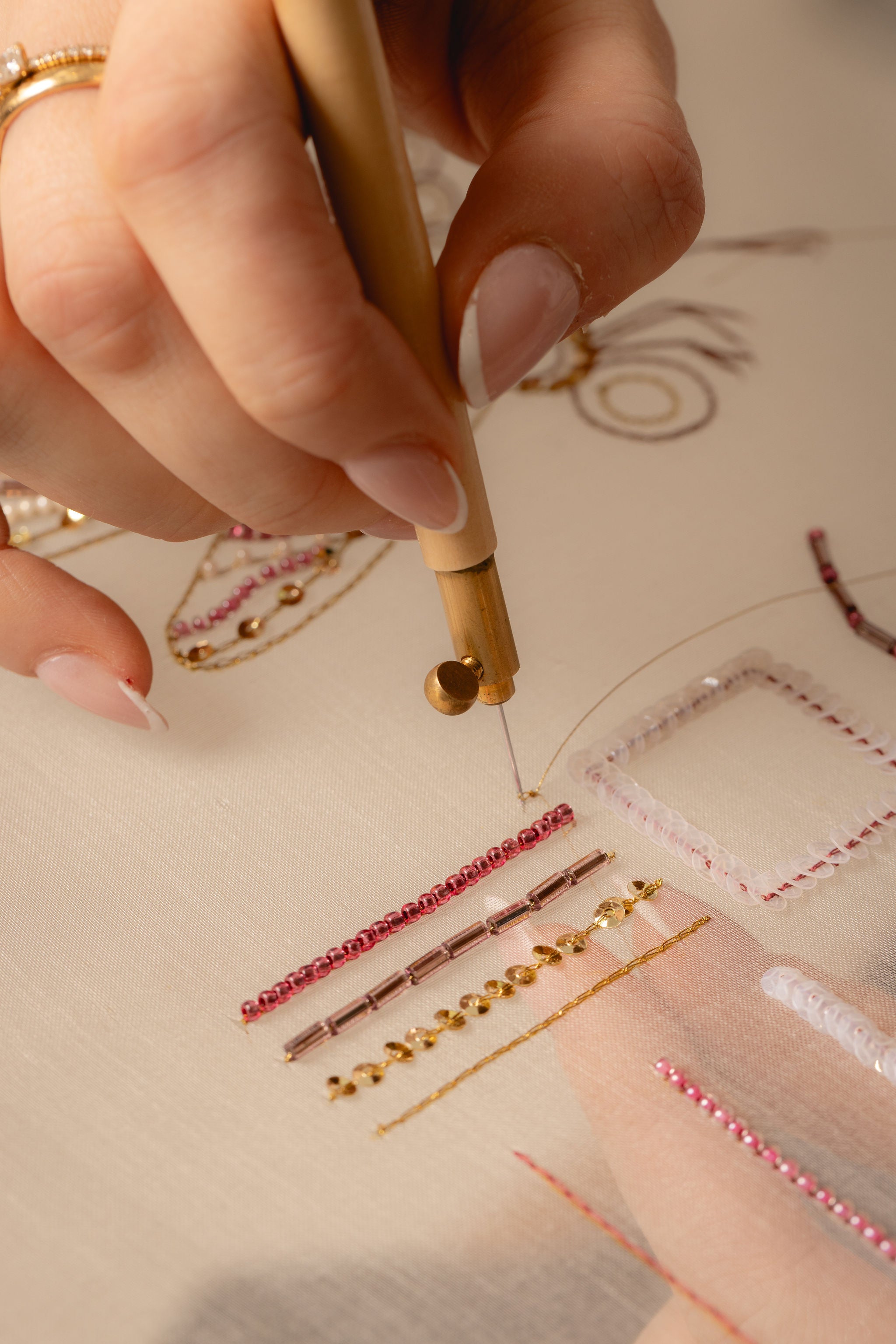 Hand & Lockの刺繍コースは、生徒を主体としたアットホームな雰囲気で、あらゆるレベルの生徒がすぐにHand & Lockコミュニティの一員であると感じられることで知られています。少人数制のクラスと、きめ細やかで親しみやすい講師陣により、誰もが創造的な目標を達成するために必要な指導と励ましを受けることができます。私たちの指導スタイルは親しみやすく実践的で、生徒一人ひとりの進歩を称えながら知識を共有することに力を入れています。このスクールを特別なものにしているのは、スクールを中心に育まれるコミュニティです。このコミュニティは協力的で創造的であり、教室を超えた友情へと発展することも少なくありません。ここで育まれる友情とサポートは、身につけるスキルと同じくらい価値のあるものとなることがよくあります。