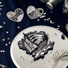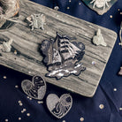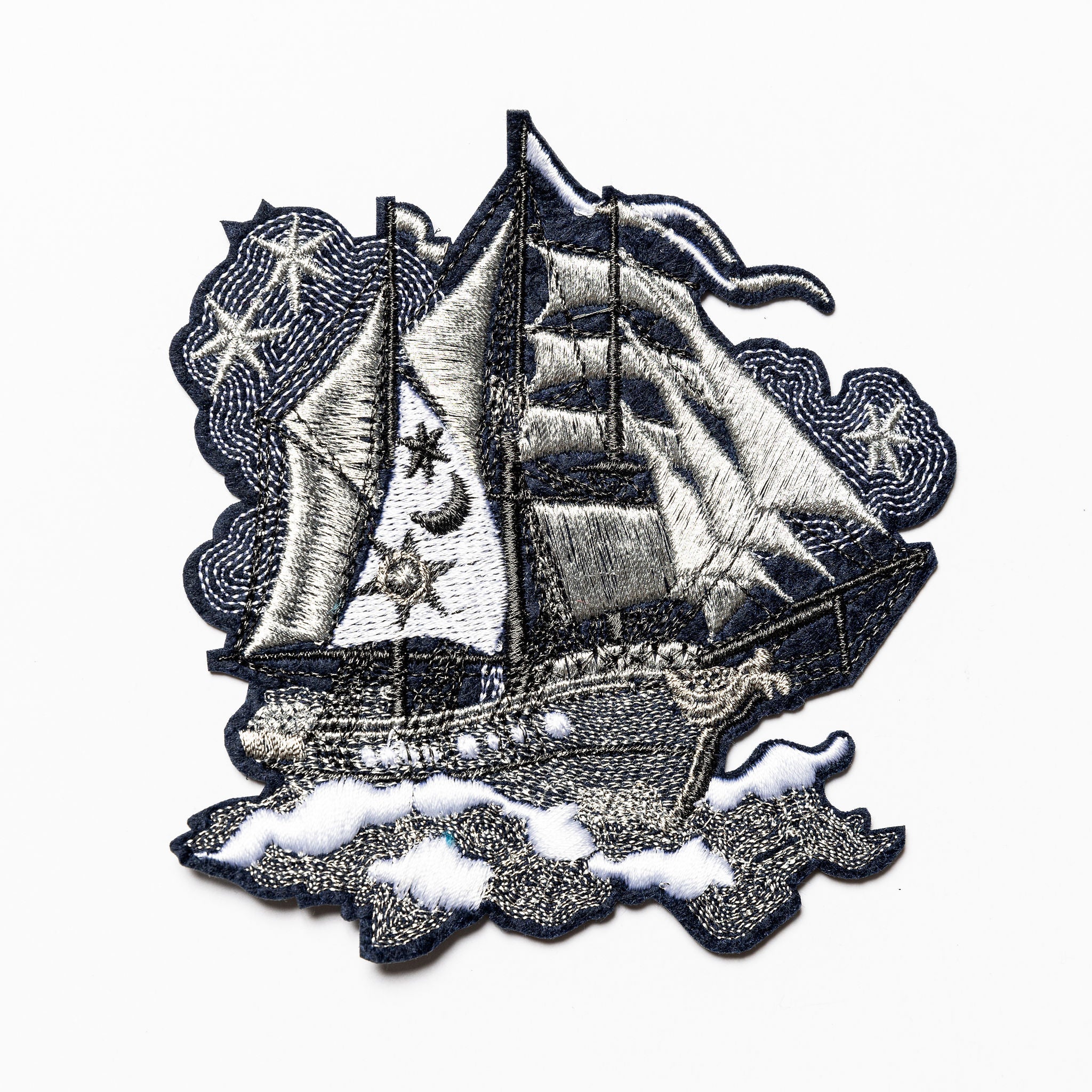 Derived by our hugely popular 'Odyssey' & 'Dark Odyssey' patches from our celestial & classic collections, The Ghost ship is the third iteration of this design. Part of our new Silver collection, The mysterious Ghost Ship features a deep navy blue background with an icy palette of metallic silver & gunmetal threads. This intricate design has been machine embroidered, incorporating techniques such as contour stitching, maze stitching and raised satin stitching. This patch is the perfect blazer pocket accessory and is available with iron on backing.
