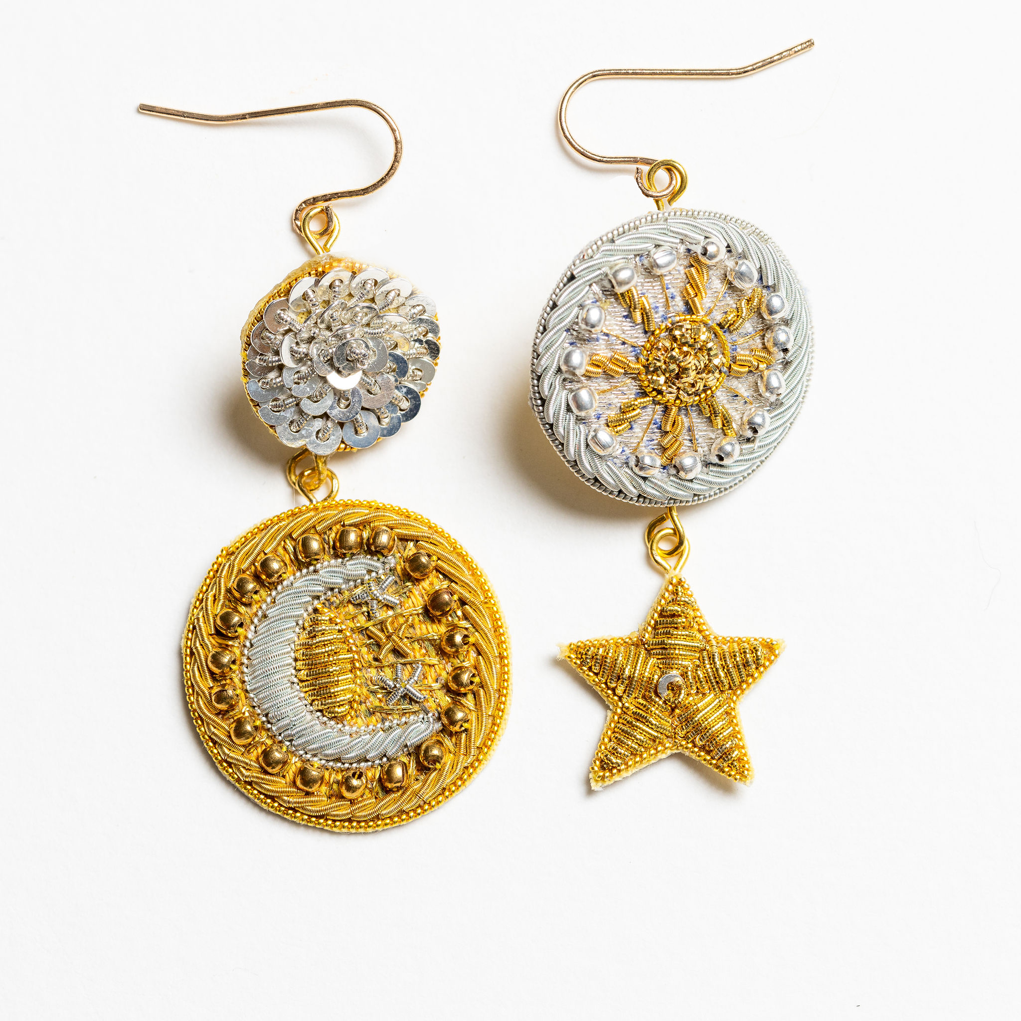 Materials: White metal bullions. Backed with Gold metallic faux leather. Gold plated earring hoops.