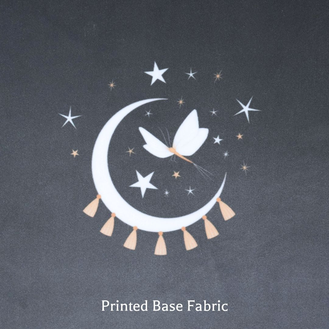 Bright gold and silver stars shimmer against a dark teal velvet base. The moon is embellished with glittering silver bright check bullion and decorative golden 'tassels'.