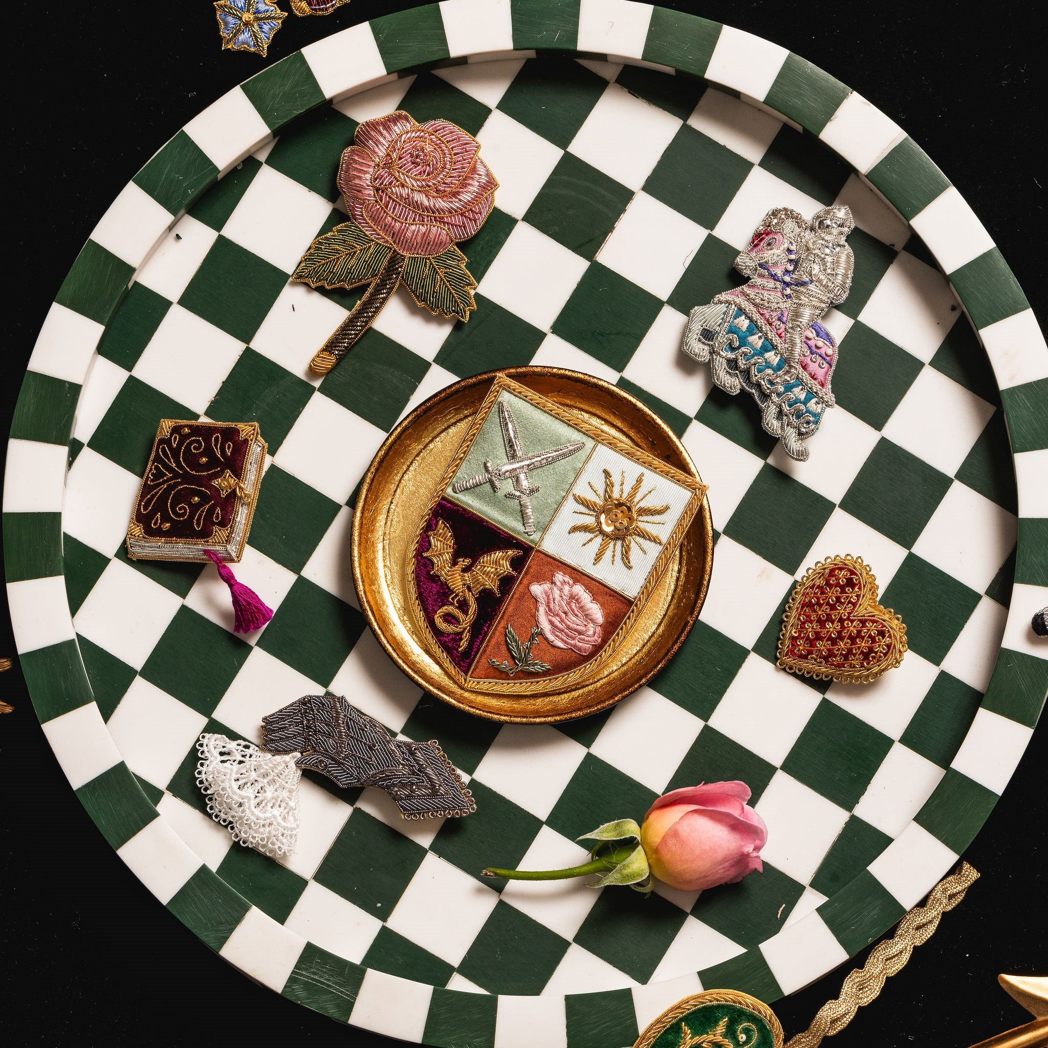 The elaborate knight brooch encapsulates Sir Hand from 'Once upon a time in Lunéville' as he rides into tournament in a full suit of armour and riding an ornately decorated horse in full caparison. Featuring blue and pink layers of satin applique and glittering silver bullions.