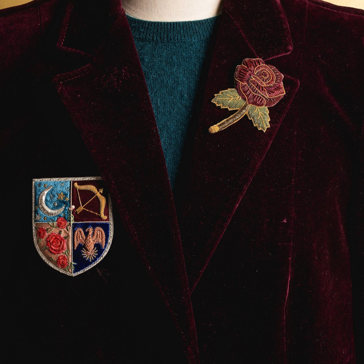 Materials: Burgundy & pink Satin, Navy & blue velvet. White metal bullions and cotton threads. Backed in gold metallic faux leather. 2x gold plated brooch pins